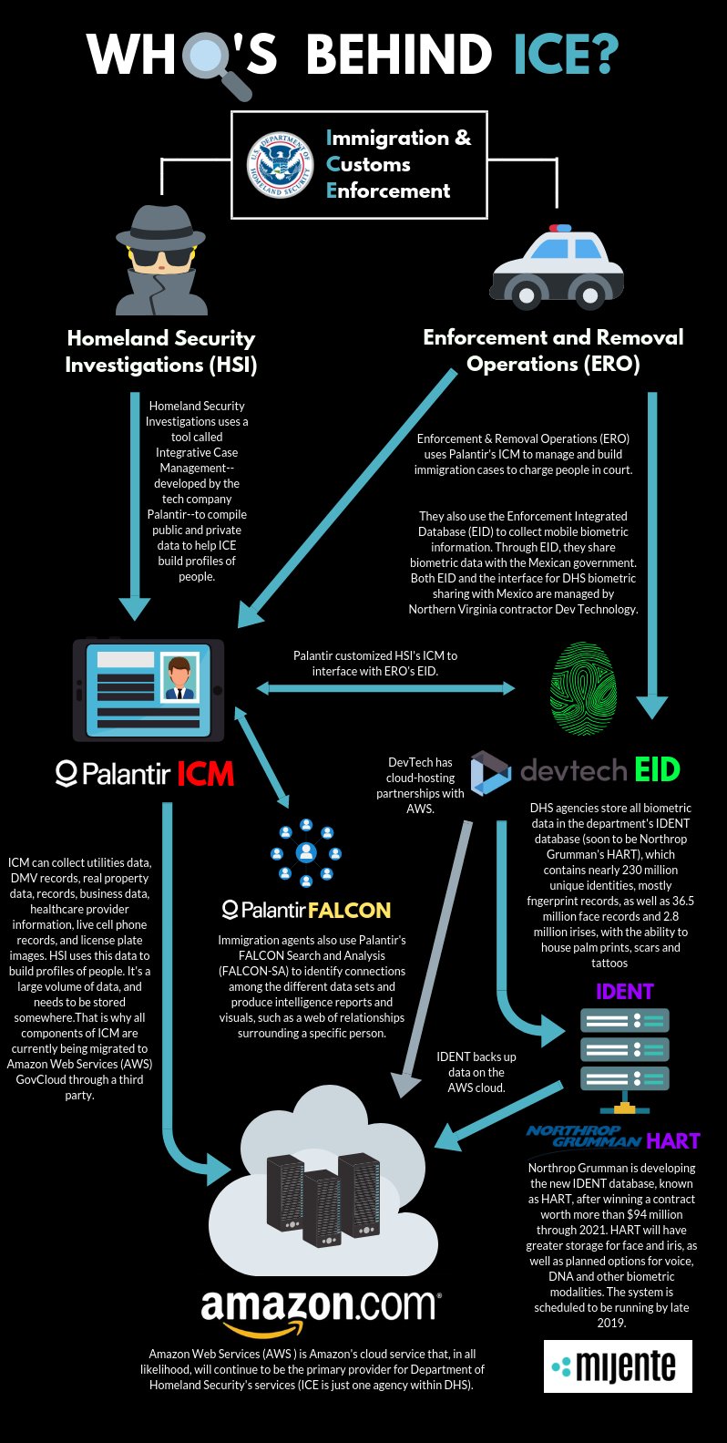 Graphic explainer of connections between ICE and tech/data companies like Amazon and Palantir
